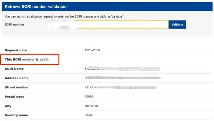 查询结果显示:This EORI number is valid.则EORI号码有效。