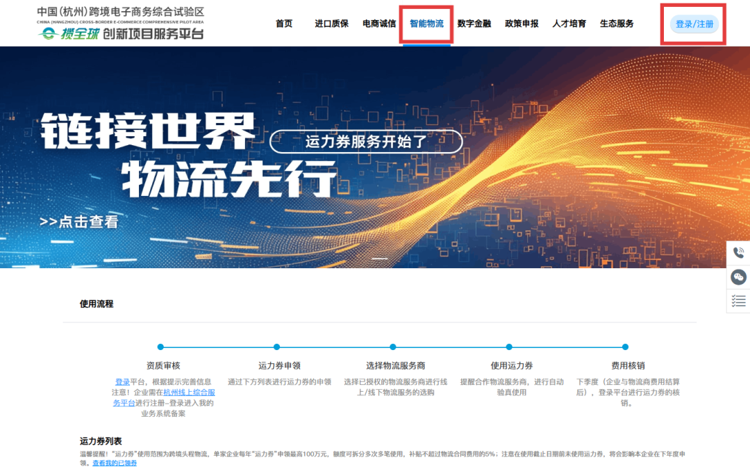 打开 e 揽全球创新服务平台智能物流模块,注册并登录账号。网址:www.e-box.org.cn/intelligent-logistics(长按复制到浏览器打开)