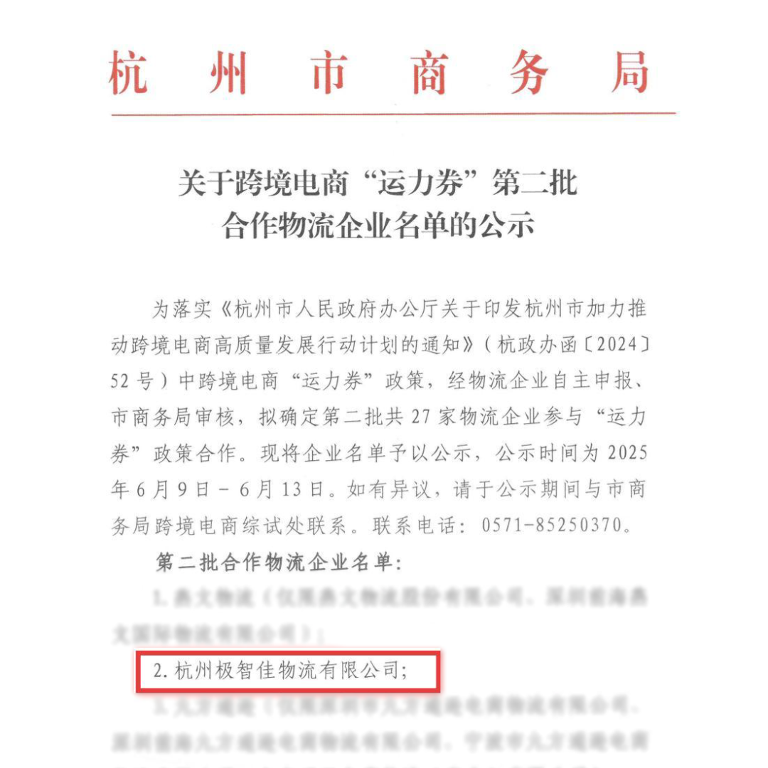 凭借专业合规的国际物流服务、完善的全球物流网络及优秀的自研物流系统,极智佳速运成功入选杭州市政府首批跨境电商“运力券”认证物流企业,成为其重点支持的跨境物流服务商之一!